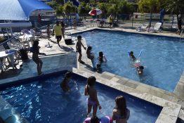 Enfim, chegou a atividade preferida da garotada: o banho de piscina acompanhado pelas divertidíssimas brincadeiras aquáticas. Segundo a Yulia Zardini e o Luggi Cezar, ambos com dez anos, a aprovação é geral. “Todas as atividades da colônia são animadas, mas todo mundo gosta mais é do banho de piscina. É o mais divertido “, conta Yulia. Frio, que nada, para esta turminha. “Banho de piscina é bom que refresca. Tava muito quente”, conclui Luiggi.